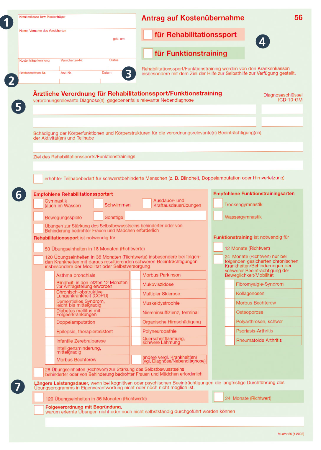 Seit 1. Januar 2023 gilt ein neues Muster 56 zur Abrechnung von Rehabilitationssport (Rehasport) und Funktionstraining mit gesetzlichen Kostenträgern.