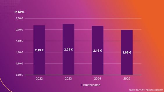 Im betrachteten Leistungszeitraum blieben die Bruttokosten therapeutischer Leistungen annähernd stabil – von 2,19 Milliarden Euro im Jahr 2022 auf 1,98 Milliarden Euro im Jahr 2025. Diese Entwicklung deutet auf eine strukturelle Veränderung innerhalb der Versorgung hin.