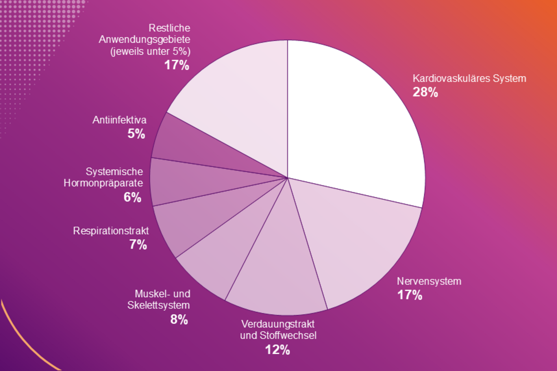 Herz-Kreislauf-Erkrankungen führen die Statistik für Todesursachen in Deutschland an, was sich 2025 auch auf den eingelösten Rezepten in Apotheken widerspiegelt: Arzneimittel für kardiovaskuläre Erkrankungen gehören zu den häufigsten Medikamenten, die abgerechnet wurden. Sie machen knapp unter einem Drittel aller Verschreibungen in den Apotheken aus. Auf dem zweiten Platz folgen Medikamente, die auf das Nervensystem wirken, wie Schmerzmittel oder Analgetika – als Begleitmedikamente sind sie ein unverzichtbarer Bestandteil vieler Medikationspläne. Am dritthäufigsten wurden 2025 Medikamente für den Verdauungstrakt und Stoffwechsel verschrieben.