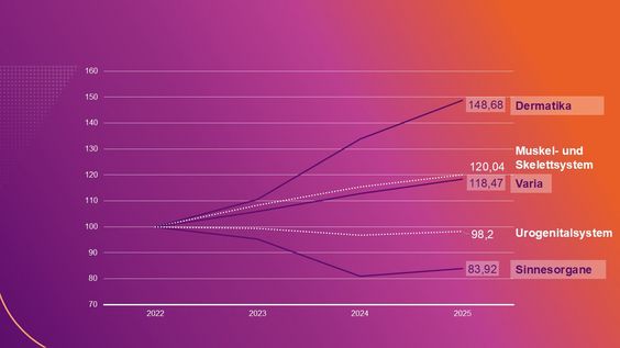 Die deutlichste Preisentwicklung gab es in den vergangenen drei Jahren bei Medikamenten für Hautkrankheiten, sogenannten Dermatika. Im Vergleich zu 2022 ist ihr Preis durchschnittlich um fast 50 % gestiegen. Einen deutlichen Preisabschlag gab es dagegen bei Medikamenten für Sinnesorgane.